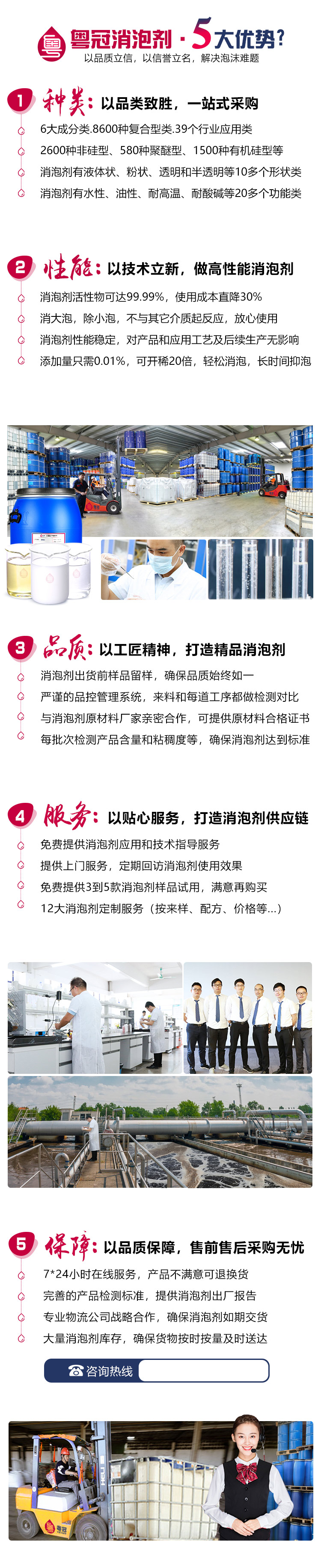 粵冠消泡劑產(chǎn)品廣泛應(yīng)用于水處理、切削液、工業(yè)清洗、印染、造紙、涂料、粘合劑,生物發(fā)酵、電廠脫硫、石油開采等38個行業(yè)領(lǐng)域,有消泡解決方案3000多種類型。產(chǎn)品有有機硅類,聚醚類,礦物油類,高碳醇類,脂肪酸類,有單體,有復(fù)合體,有透明的,有淡黃的,有乳白的各種類型消泡劑,實現(xiàn)一站式采購。